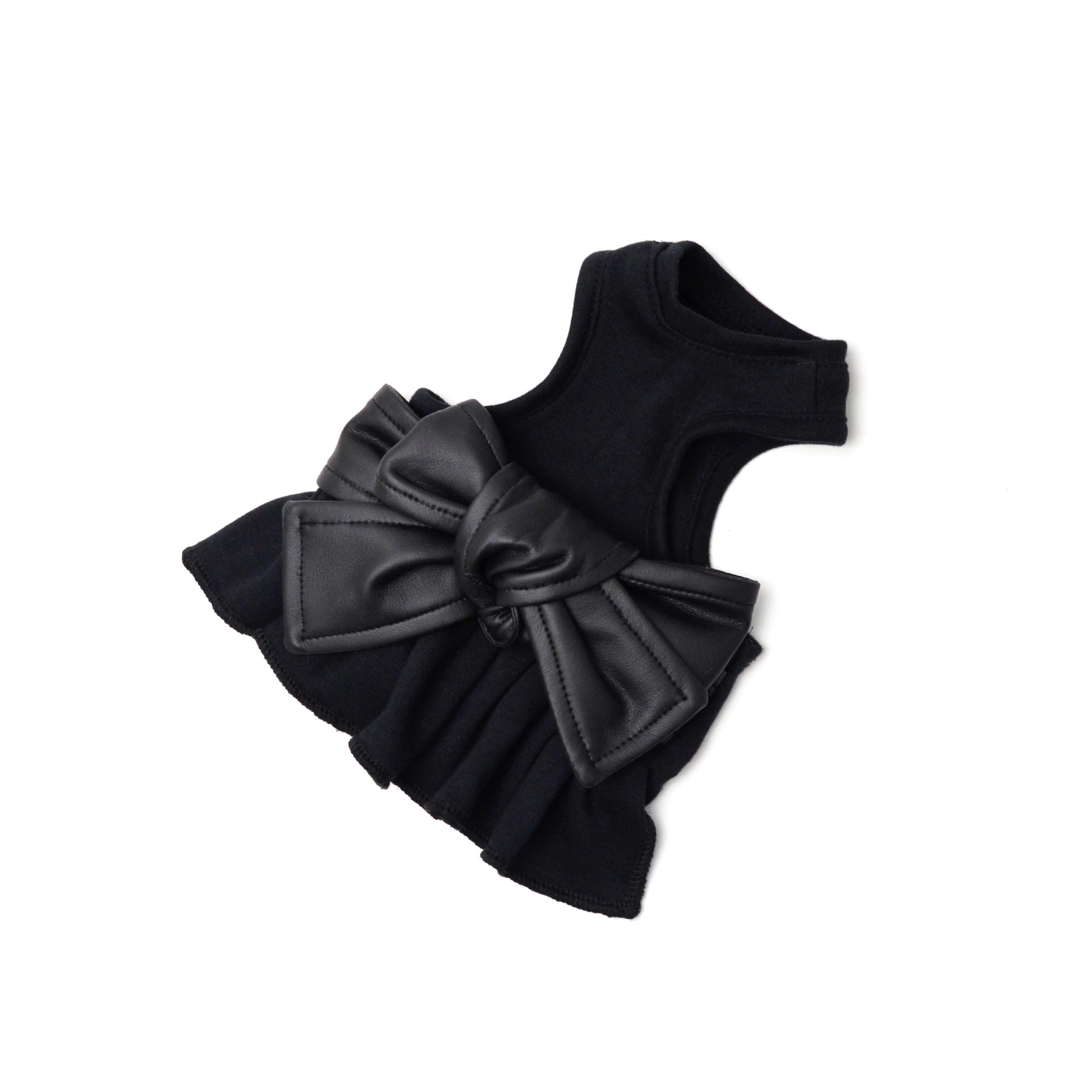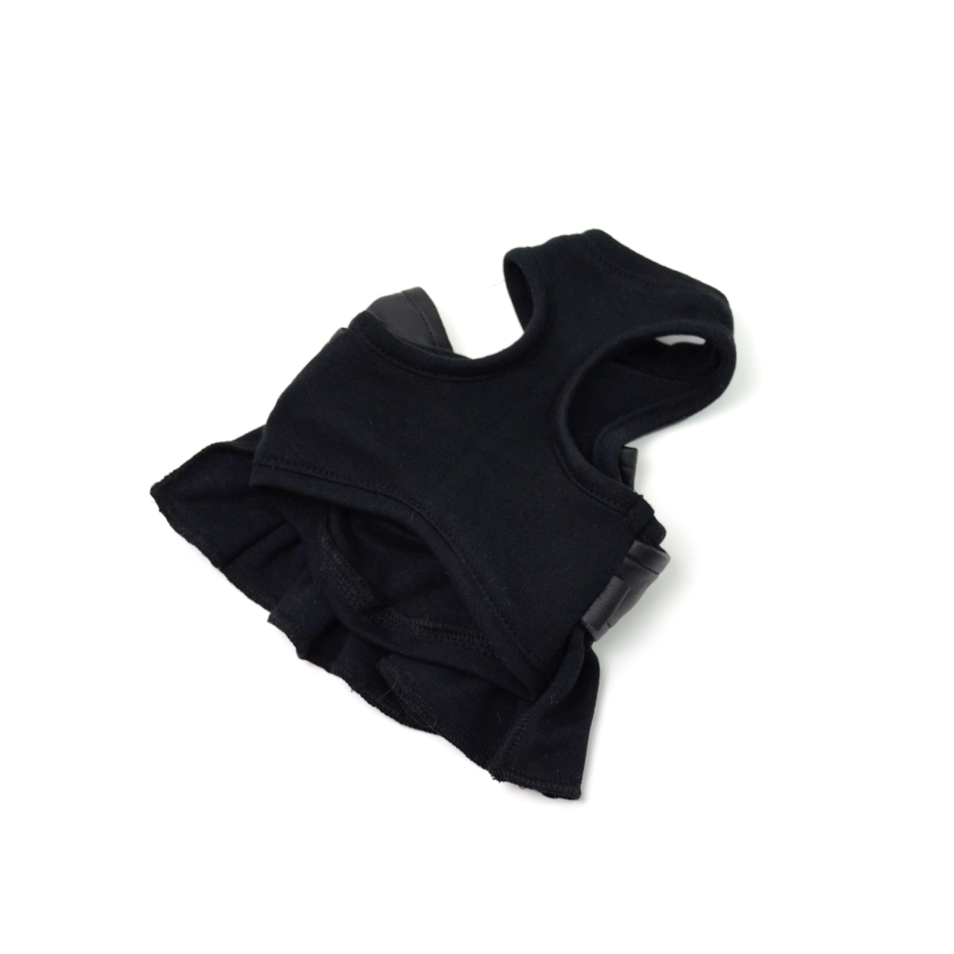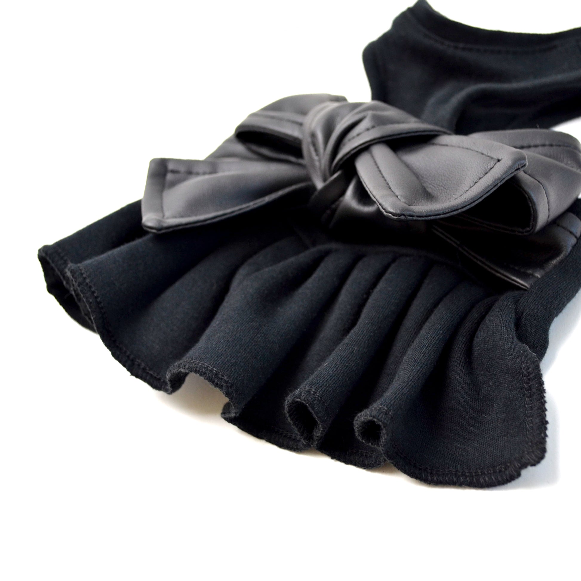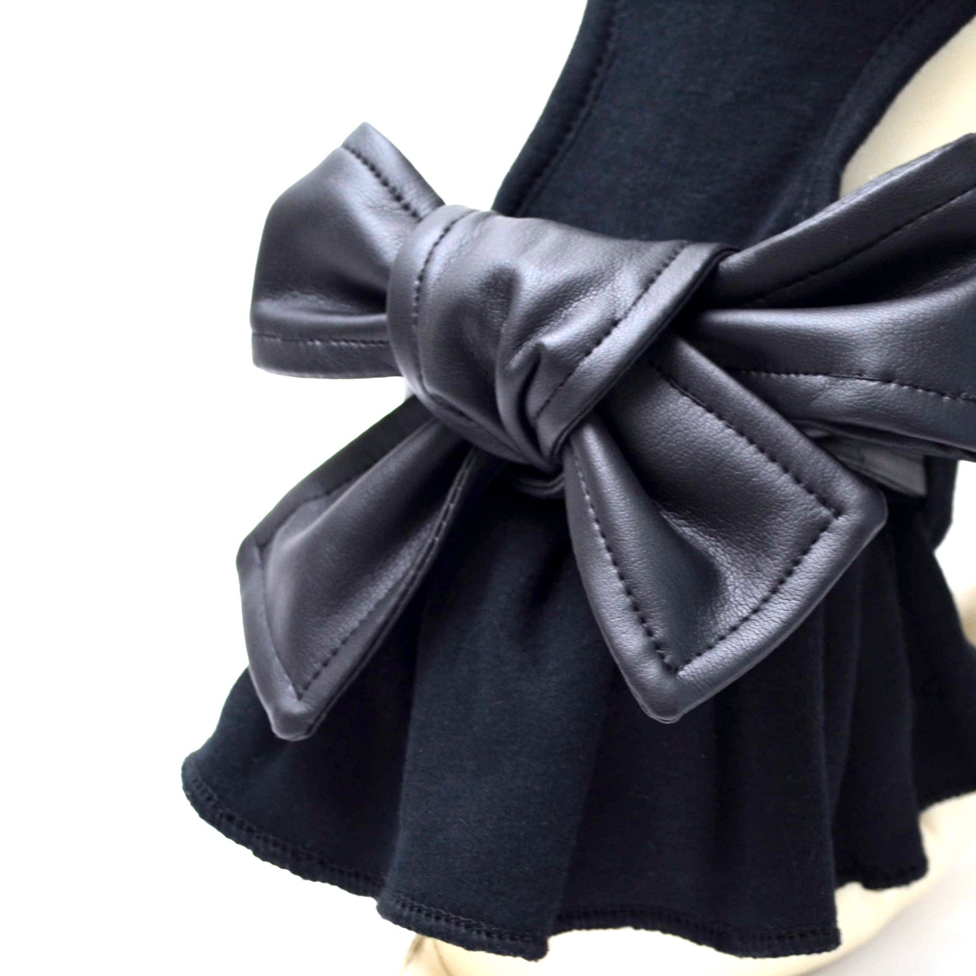 ドレープド仕様のスカート部、背面にあしらったエコレザー素材のリボンのでティールが特徴的なシルエットでまとめられたアイテム。カットソー地であるがハリ感のあるスカートは愛犬へのフィット感も与えてくるでしょう。