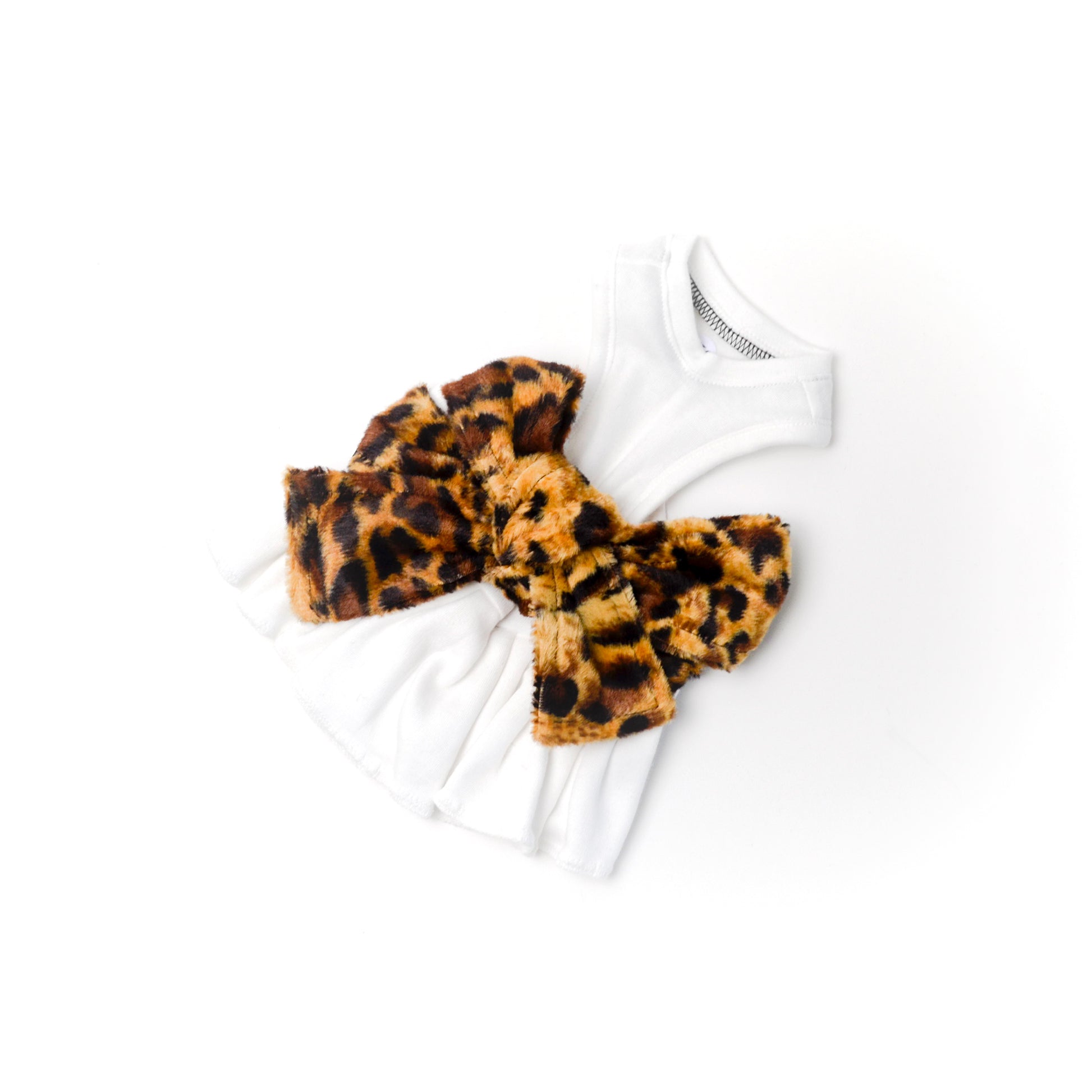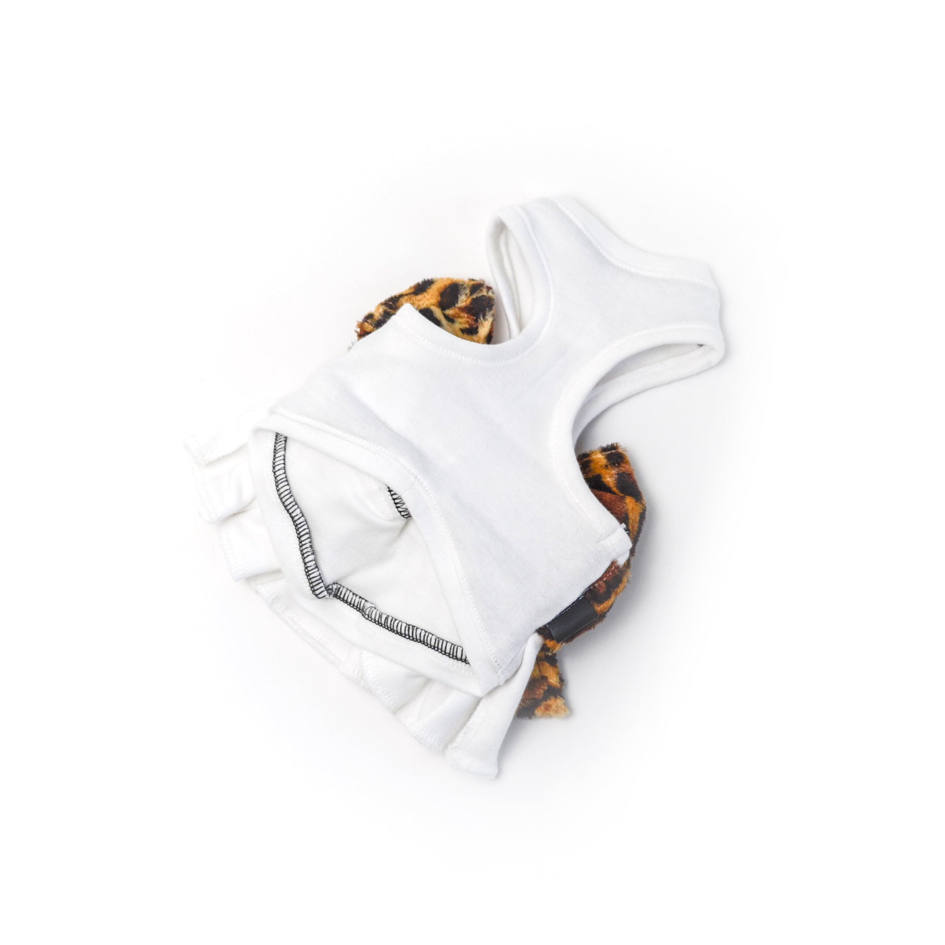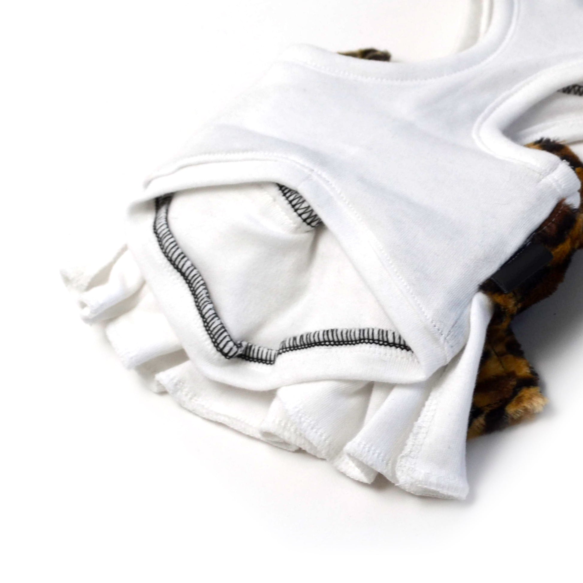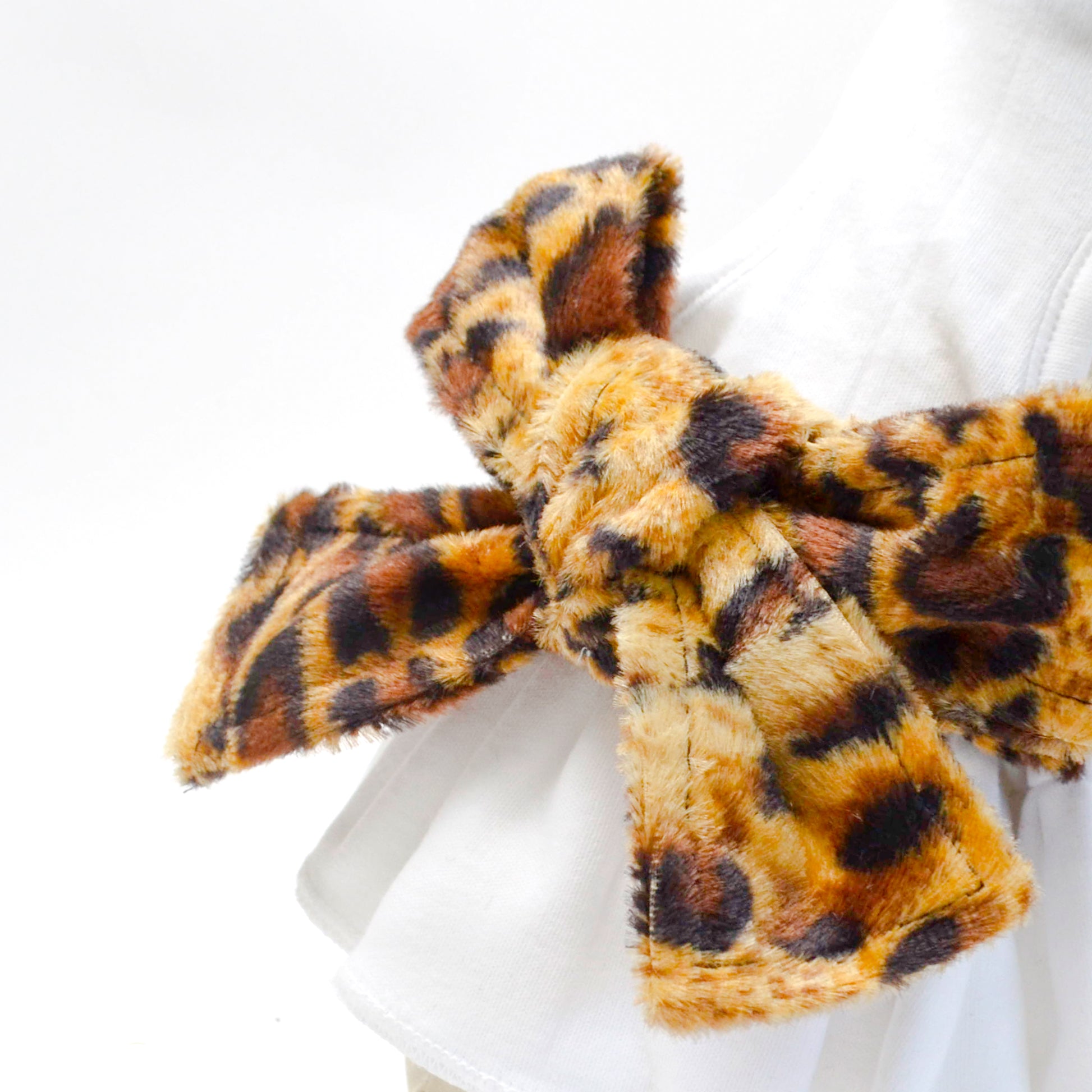 ドレープド仕様のスカート部、背面にあしらったエコレザー素材のリボンのでティールが特徴的なシルエットでまとめられたアイテム。カットソー地であるがハリ感のあるスカートは愛犬へのフィット感も与えてくるでしょう。